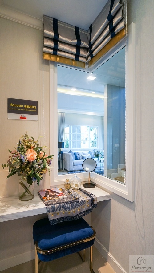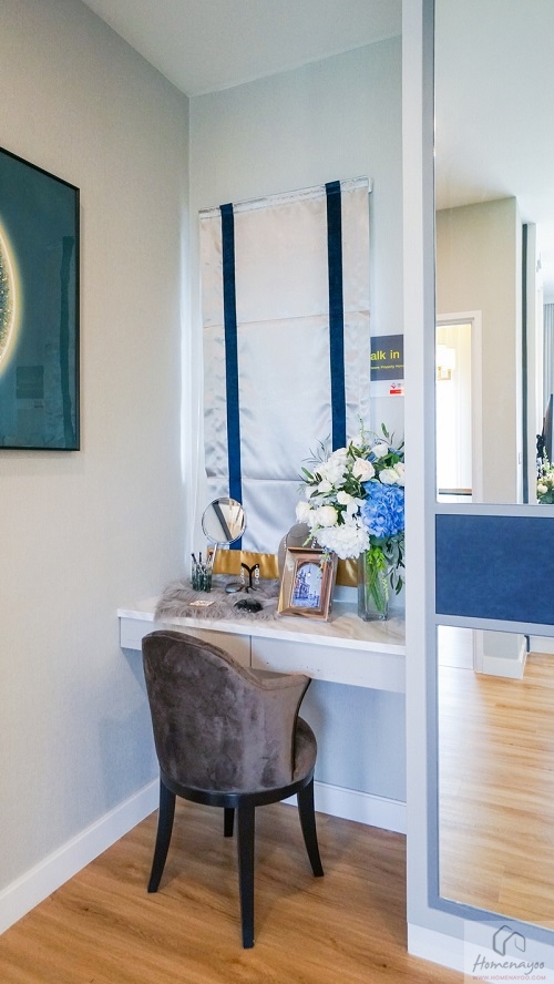 เมื่อเข้ามาจะเจอกับโซน Walk-in Closet ก่อนอันดับแรกเลย มีการ Built-in เป็นมุมเคาน์เตอร์โต๊ะเครื่องแป้ง พร้อมมีหน้าต่างเป็นช่องรับแสงธรรมชาติให้ 1 บาน