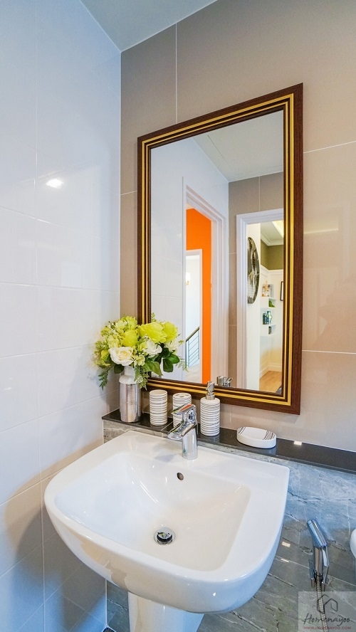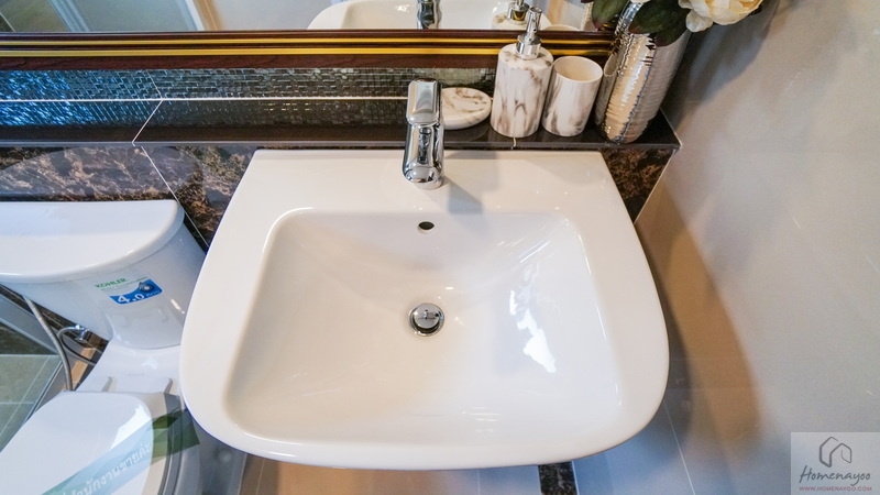 มุมอ่างล้างหน้าใช้อ่างทรงรีแบบแขวนผนังของ Kohler คู่กับก๊อกน้ำโครเมียมก้านโยกใช้งานสะดวก ติดกระจกเงาทรงสี่เหลี่ยมบานใหญ่มาให้ 1 บาน และมีหน้าต่างระบายอากาศบานกระทุ้งกระจกฝ้าให้ 1 บาน
