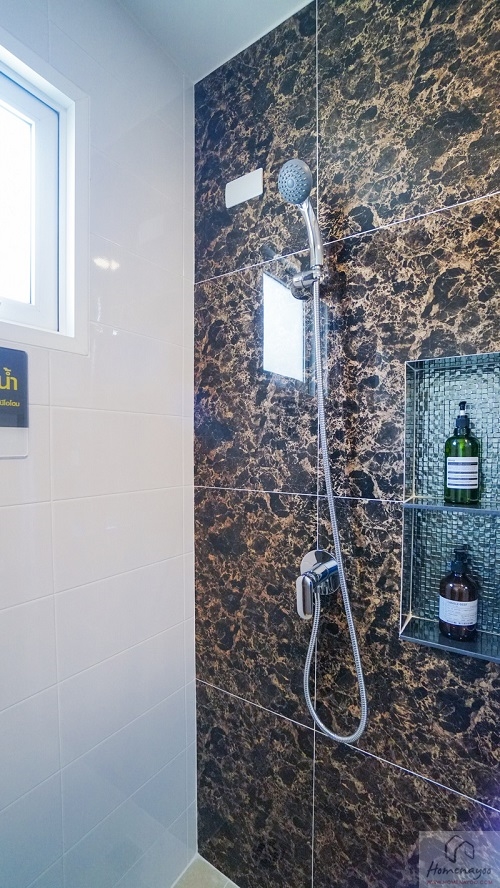 มุมอาบน้ำใช้ Hand Shower ของ Kohler คู่กับก๊อกน้ำโครเมียมก้านโยกเปิดใช้งานได้สะดวก พร้อมเจาะผนังทำเป็นชั้นวางของใช้ต่าง ๆ ได้ ที่ผนังสามารถติดตั้งเครื่องทำน้ำอุ่นได้อีก