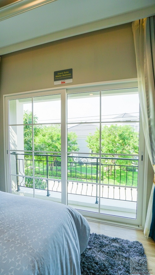 มาดูที่ด้านข้างเตียงนอนกันบ้าง ฝั่งซ้ายจะมีประตูบานเลื่อนขนาดใหญ่เปิดออกไปยังพื้นที่ระเบียงหน้าบ้านได้