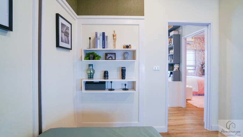 ส่วนฝั่งปลายเตียง Built-in เป็นโต๊ะอ่านหนังสือ มีชั้นวางของสวย ๆ หรือจะใช้เป็นโต๊ะทำงานก็ได้ค่ะ