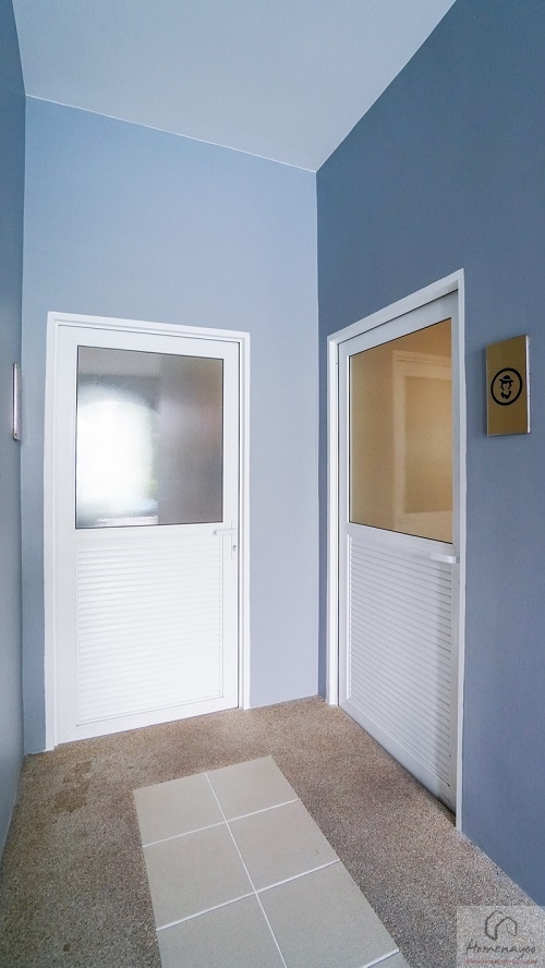 ติดกับประตูทางเข้าห้องน้ำตกแต่งเป็นชั้นวางของดีไซน์สุดเก๋