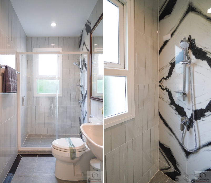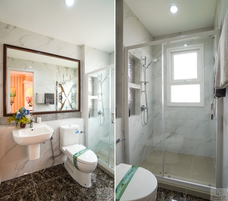 อีกฝั่งเป็นพื้นที่ส่วนเปียก ติดตั้งฉากกั้นอาบน้ำมาให้แบบบานเลื่อน ด้านในติดตั้ง Hand Shower ปรับระดับสูงต่ำได้ พร้อมเดินงานระบบไฟฟ้าติด Junction Box รองรับการติดตั้งเครื่องทำน้ำอุ่นมาให้เรียบร้อย ในห้องน้ำมีช่องแสงเป็นบานกระทุ้งเปิดระบายอากาศได้