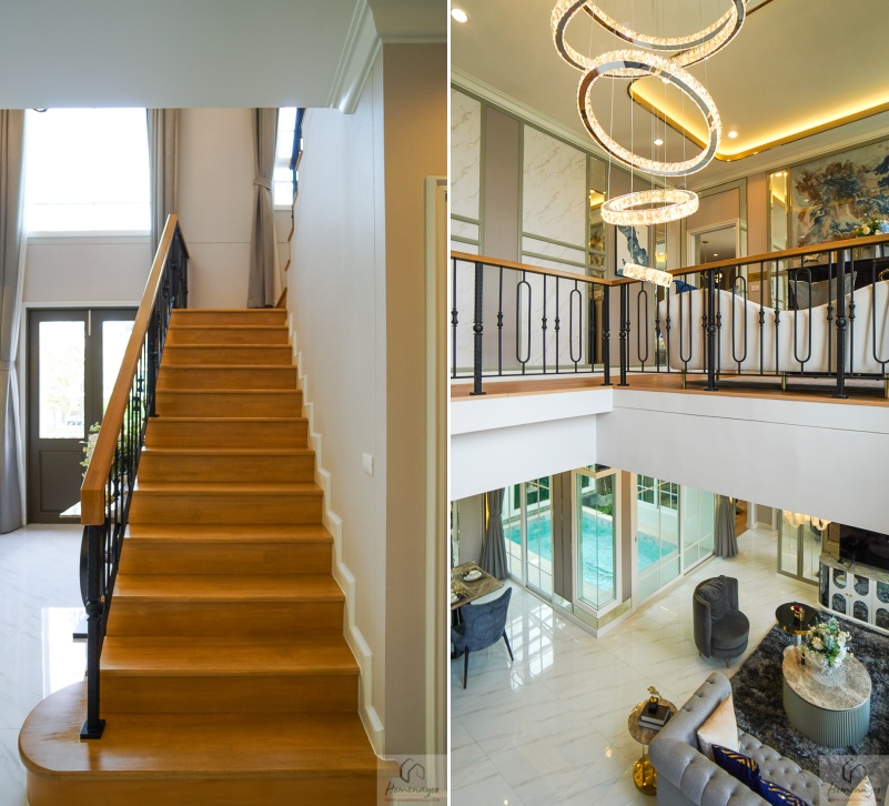 ตรง Foyer ฝ้าเพดานสูงแบบ Double Volume มองเห็นเชื่อมต่อถึงชั้น 2 ตรงนี้เราติด Chandelier สวย ๆ ได้ตามต้องการครับ