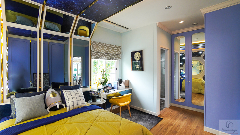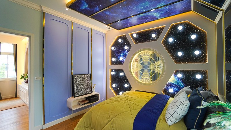 ห้องนอน 4 มีพื้นที่มาให้พอสมควร บ้านตัวอย่างวางเตียงเดี่ยว และตู้เสื้อผ้ามาให้ดู มีพื้นที่เหลือรอบ ๆ เหมาะจะเป็นห้องผู้สูงอายุ ไม่ต้องเดินขึ้นลงบันไดลำบาก พื้นห้องนอนปูด้วย SPC
