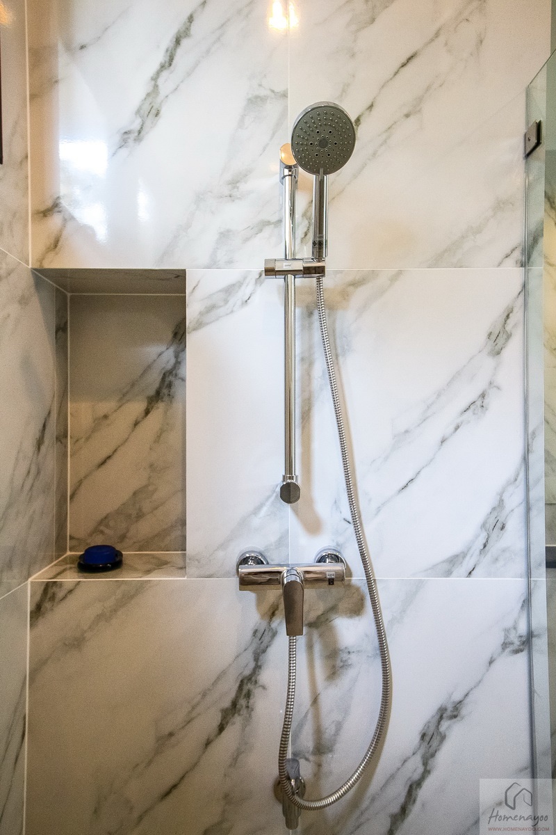 ฝักบัวเป็นแบบ Hand Shower ก๊อกน้ำโครเมียมก้านโยก แบบผสมน้ำร้อน-น้ำเย็น ผนังเจาะช่องทำชั้นวางของมาให้ 1 จุด สามารถวางสบู่ แชมพู อุปกรณ์อาบน้ำได้เยอะ
