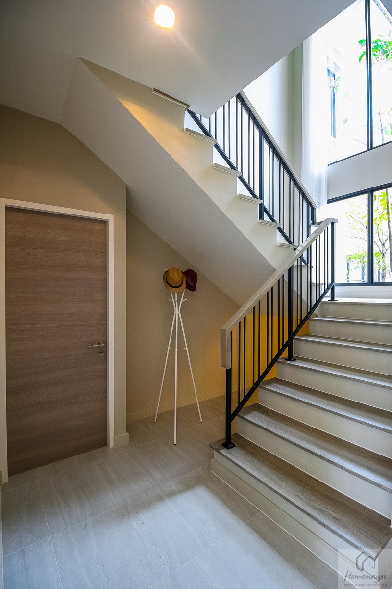 โถงบันไดบ้านสูงโปร่ง มีชุดหน้าต่างกระจกบานฟิกซ์ขนาดใหญ่พิเศษ ใช้เป็นช่องแสงธรรมชาติในตอนกลางวัน เพดานติดโคมไฟมาให้ 1 ดวง ไว้เปิดให้แสงสว่างในเวลากลางคืน