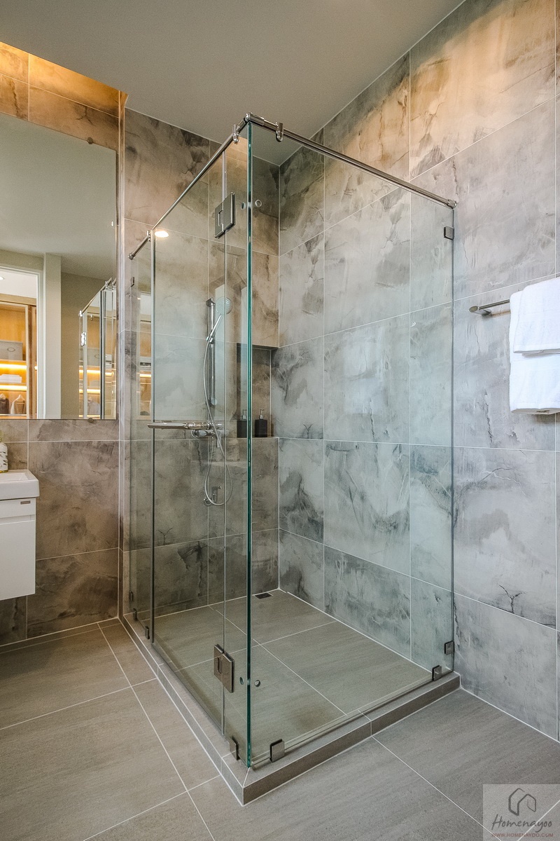 ถัดเข้าไปด้านในสุดเป็นส่วนอาบน้ำ โครงการติด Shower Box ประตูบานสวิง มือจับสแตนเลสตัว U ที่แขวนผ้าเช็ดตัวได้ ผนังภายในส่วนอาบน้ำกรุด้วยกระเบื้องลายหินอ่อนโทนสีเทา ดูหรูหรา น่าใช้งานมาก ๆ ค่ะ