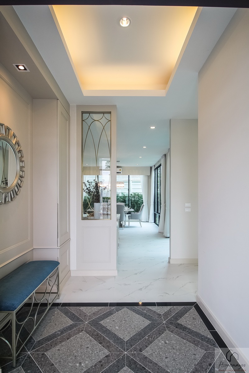 บริเวณ Foyer จะตกแต่งพื้นแกรนิตโต้ลายหินคุมโทนเทา-ดำ โดยใช้การปูแบบสลับเป็นรูปทรงเลขาคณิต ให้มีความหรูหรา สวยงาม โดยพื้นที่จุดนี้จะสามารถวางตู้เก็บรองเท้า, เก้าอี้นั่งรอ หรือ ต้นไม้กระถางสวย ๆ เพิ่มเติมเข้าไปได้ตามชอบ