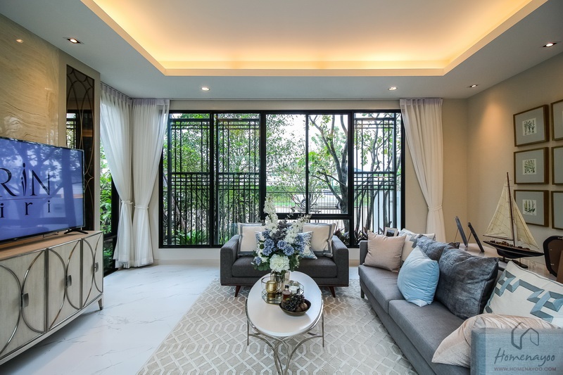 เริ่มกันที่ห้องนั่งเล่น บริเวณโถงบ้านชั้น 2 กันก่อน โครงการจัดเป็นมุมพักผ่อนมาให้ดูไอเดีย บ้านจริงจะเป็นพื้นที่โล่ง พร้อมหน้าต่างกระจกบานเลื่อนชุดใหญ่ จุดนี้สามารถปรับเป็นมุมห้องพระ, มุมทำงาน, มุมทำการบ้านของเด็ก ๆ หรือ โซน Home Fitness ได้