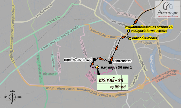 การเดินทาง เริ่มจากทางพิเศษเฉลิมมหานคร ทางออก 26 ถนนสุขสวัสดิ์ (พระประแดง) ⇒ ถนนสุขสวัสดิ์ ⇒ กลับรถที่แยกวัดสน ⇒ ซอยสุขสวัสดิ์ 50 ⇒ ถนนประชาอุทิศ ⇒ แยกนาหลวง ⇒ ถนนพุทธบูชา ⇒ แยกกำนันธารทิพย์ ⇒ ซอยพุทธบูชา 36 ขับตรงไปอีก 950 เมตร เลี้ยวเข้าแยก 1 อีกประมาณ 350 เมตรถึงโครงการ พราวด์ 36 บาย สิริการย์