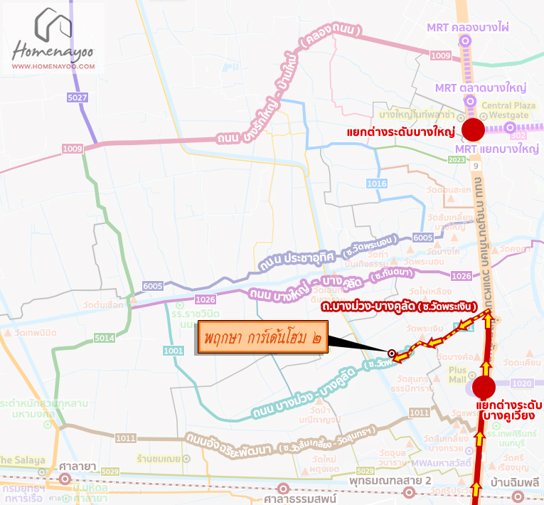 การเดินทางเริ่มจาก ถ.กาญจนาภิเษก วงแหวนรอบนอกฯ ฝั่งตะวันตก ⇒ ถ.บางม่วง-บางคูลัด (ซ.วัดพระเงิน) ขับตรงไปอีก 2.5 กม. ถึงโครงการพฤกษา การ์เด้นโฮม 2