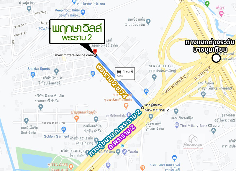 วิ่งตรงจนสุดทาง ระยะทาง 350 เมตร ถึงโครงการ ทาวน์โฮม พฤกษาวิลล์ 32 พระราม 2