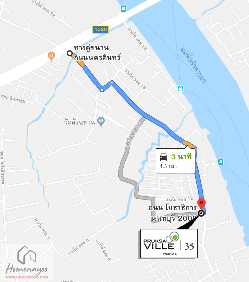 การเดินทาง เริ่มจาก ถ.นครอินทร์ (สะพานพระราม 5)  ถ.โยธาธิการ นนทบุรี 3007 (ซ.วัดสังฆทาน) ขับตรงไปอีก 1.3 ม. ถึงโครงการ พฤกษาวิลล์ 35 พระราม 5
