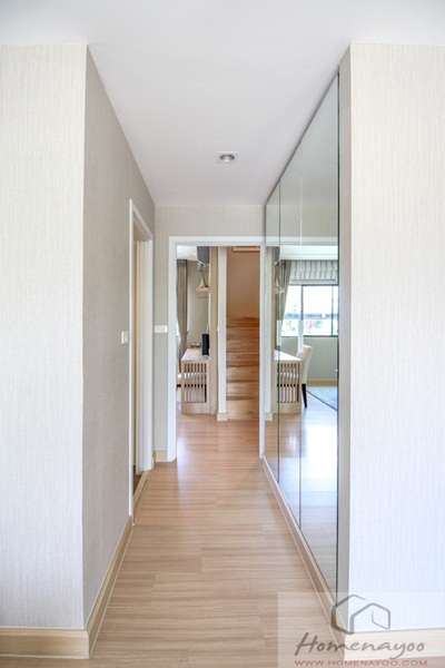 จากโถงบันได มองเข้าไปที่ห้องนอน 2 และห้องนอน 3 จะเห็นว่าประตูทางเข้าห้องน้ำจะอยู่ภายในทั้งสองห้องนอนเลยค่ะ ใช้ร่วมกัน ทะลุถึงกันได้
