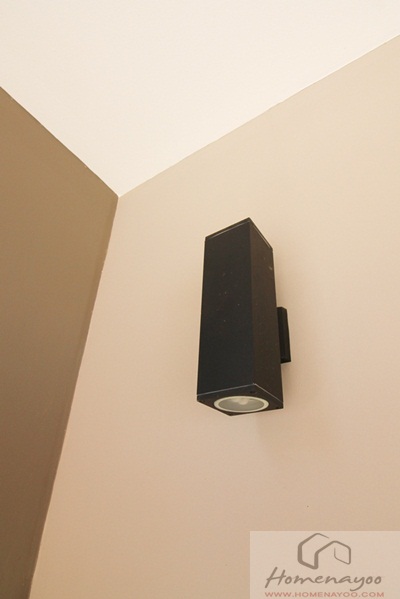 เหนือหน้าต่างระเบียงจะเป็นบัวหยดน้ำคอนกรีตยาวและกว้างพอจะเป็นกันสาดเล็กๆได้ ด้านบนติดไฟเพดานแบบส่องผนังให้ 1 โคม สังเกตฝ้าเพดานเหนือบัวหยดน้ำเป็นยิปซัมบอร์ดกันชื้น แบบระบายอากาศ