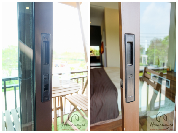 ประตูและหน้าต่างภายนอกเป็นบานเลื่อนและบานกระทุ้งกรอบอลูมิเนียมอบสีน้ำตาล กระจกเขียวตัดแสง, บานประตูภายในบ้านเป็นบาน HDF วงกบ UPVC ส่วนประตูห้องน้ำเป็น UPVC สีขาว, อุปกรณ์ปลั๊กและสวิทช์ไฟของ Schnider