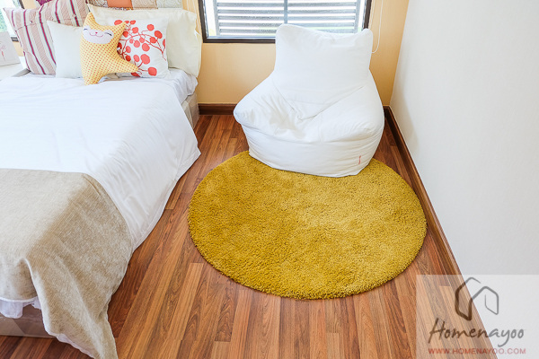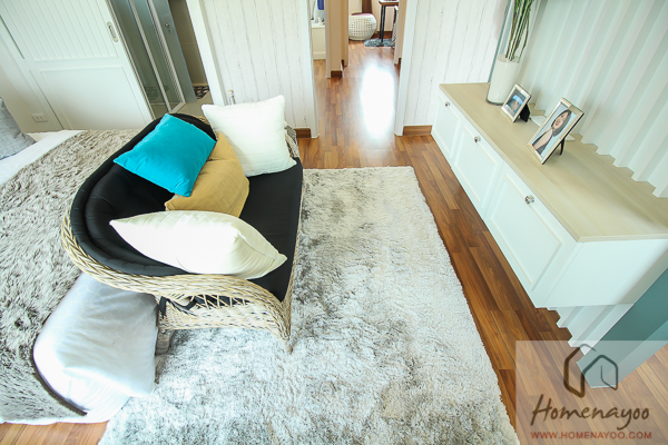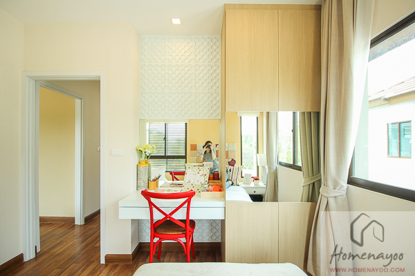ฝั่งปลายเตียงวางตู้เตี้ยๆสำหรับเก็บของไว้ให้ดูเป็นตัวอย่างจะเห็นว่าที่โครงการวางได้แค่ตู้เตี้ยๆแบบนี้เพราะติดบานหน้าต่าง ซึ่งในบ้านแปลงมาตรฐานผนังฝั่งนี้จะเป็นผนังทึบ เราสามารที่จะวางตู้สูงกว่านี้ หรือจะติดเป็นตู้ลอยก็ยังได้ค่ะ