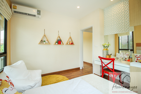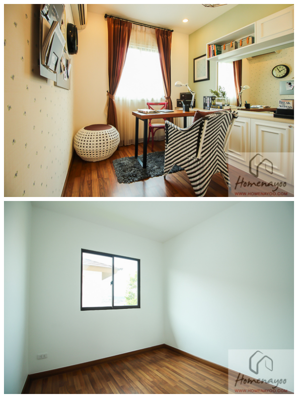 ห้องนี้มีขนาดประมาณ 2.5 x 2.5 เมตร มีช่องแสงเพียงจุดเดียวคือบานหน้าต่างทางหลังบ้าน บ้านตัวอย่างที่ทางโครงการจัดมาให้ดูเป็นห้องทำงาน ซึ่งจริงๆแล้วเราสามารถที่จะทำเป็นห้องนอนได้ โดยขนาดเตียงที่เหมาะสมกับห้องนี้ก็จะเป็นเตียงขนาด 3.5 ฟุตค่ะ