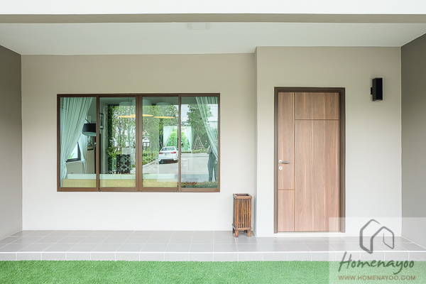 ถึงแม้ว่าประตูทางเข้าบ้านจะเป็นประตูทึบ แต่ยังมีหน้าต่างบานเลื่อนคู่และบานเลื่อนเดี่ยวที่เป็นช่องแสงให้กับห้องนั่งเล่นได้ค่ะ