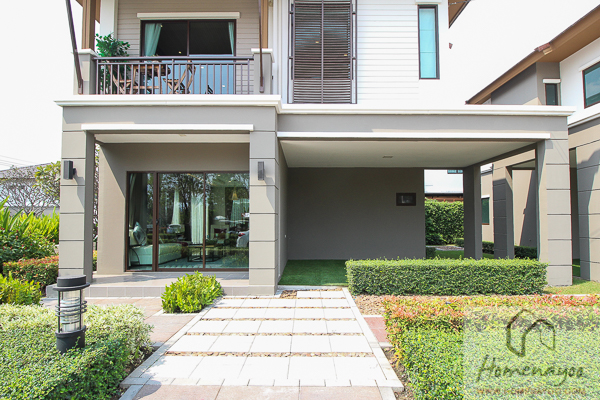 บ้านและวัสดุ : มีการออกแบบโดยรวมในสไตล์บาหลี ที่เพิ่มความโมเดิร์นเข้าไปด้วย โดยจุดที่เพิ่มความเป็นบาหลีให้ตัวบ้านแบบเห็นได้ชัดเลยคือการวางไม้ค้ำยันใต้หลังคาและโทนสีน้ำตาล – เทา บวกกับการที่โครงการจัดสภาพแวดล้อมให้มีความร่มรื่น ทำให้ได้กลิ่นอายบรรยากาศเหมือนอยู่รีสอร์ทแบบเบาๆเลยค่ะ