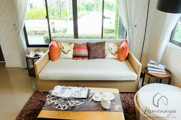 บ้านตัวอย่างวางโซฟาขนาด 2 – 3 ที่นั่งมาให้ดูแบบนี้ซึ่งก็ดูพอดีกับพื้นที่แล้ว แต่ถ้าอยากจะเพิ่มอีกเป็น 4 ที่นั่งก็ยังพอจะไหวหรือถ้าใครชอบโซฟาตัวยาว จะวางโซฟารูปตัว L เกาะไปกับผนังอีกฝั่งก็ยังได้ แต่จะไม่มีพื้นที่ข้างโซฟาเหลือให้วางโต๊ะเล็กแล้วนะ