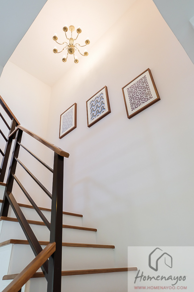 โถงบันไดทึบไม่มีช่องแสงและไฟส่องสว่างมาให้ แนะนำว่าควรติดดวงไฟเพิ่มเติม อาจจะเป็นไฟติดผนัง ติดเป็นระยะๆ 2 – 3 ดวง หรืออาจจะใช้โคมไฟระย้าเก๋ๆเหมือนในบ้านตัวอย่างนี้ก็ได้ค่ะ
