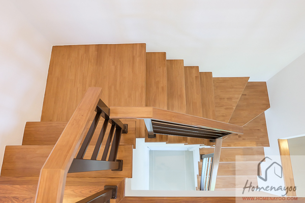 มาที่บันไดขึ้นไปชั้น 2 กันต่อ ตัวบันไดเป็นโครงสร้างคอนกรีตเสริมเหล็กปิดหน้าด้วยไม้สังเคราะห์ ราวบันไดสีน้ำตาลมือจับสีเดียวกันกับไม้ปิดหน้าบันได ส่วนที่ข้างบันไดจะมีช่องเก็บของเล็กๆอยู่ด้วย