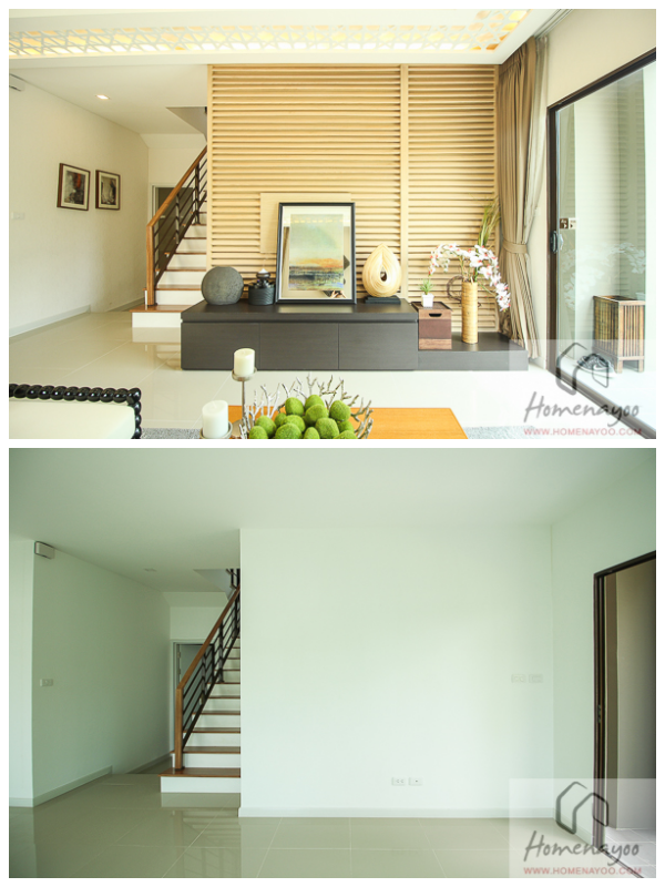ส่วนการจัดวางทีวีของห้องรับแขกอาจจะต้องอาศัยฉากหรือผนังลอยแบบนี้เพื่อจะได้กั้นแยกห้องรับแขกกับห้องทานอาหารให้เป็นสัดเป็นส่วนค่ะ