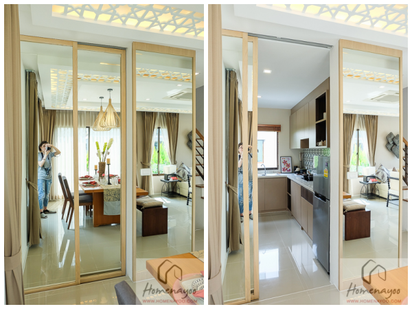 บ้านตัวอย่างก็กั้นพื้นที่มาให้ดูด้วยฉากกั้นกระจก ซึ่งฉากกั้นแบบนี้จะไม่ช่วยเรื่องกลิ่นจากการทำอาหารนะคะ แต่ถ้าบ้านไหนคิดว่าคงไม่ทำอาหารทานกันอยู่แล้วก็สามารถเก็บไว้เป็นไอเดียได้เหมือนกันค่ะ