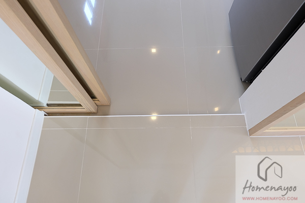 ที่พื้นห้องอาบน้ำไม่ได้มีการลดระดับมาให้แต่จะมีรางของ Shower Box ที่พอจะช่วยไม่ให้น้ำไหลซึมออกไปข้างนอกได้ค่ะ