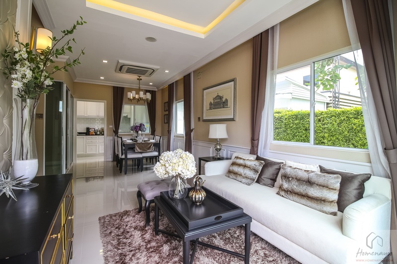 บ้านตัวอย่างมีให้ชมทั้งหมด 1 แบบ เป็นแบบ Neo Classic II ขนาด 4 ห้องนอน 2 ห้องน้ำ 1 ที่จอดรถ โดยโครงการจะขายให้แบบบ้านเปล่า ไม่มีเฟอร์นิเจอร์ตกแต่ง หลังบ้านลงเสาเข็มลึกเท่าตัวบ้านให้พร้อมต่อเติมครัวไทย พร้อมแล้วไปชมกันต่อเลยค่ะ