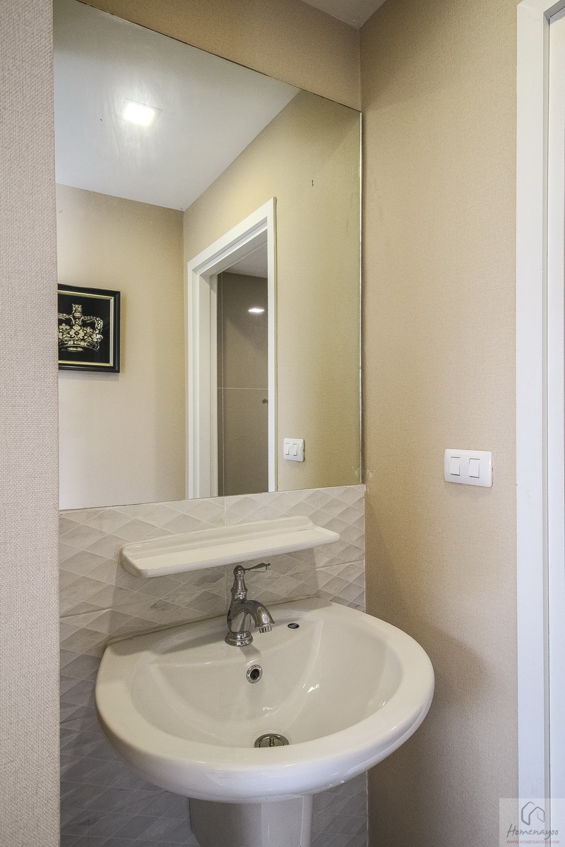 ส่วนของอ่างล้างหน้า ติดตั้งอ่างล้างหน้าแบบแขวนผนัง หน้าอ่างวางของใช้ได้เล็กน้อย ก๊อกน้ำโครเมี่ยมสไตล์คลาสสิก ทั้งหมดเป็นของ Cotto เหนืออ่างติดชั้นวางของให้ 1 อัน ผนังด้านล่างกรุกระเบื้องสีขาว 3 มิติ ส่วนด้านบนติดกระจกเงาสี่เหลี่ยมพอดีผนังให้แบบในภาพค่ะ