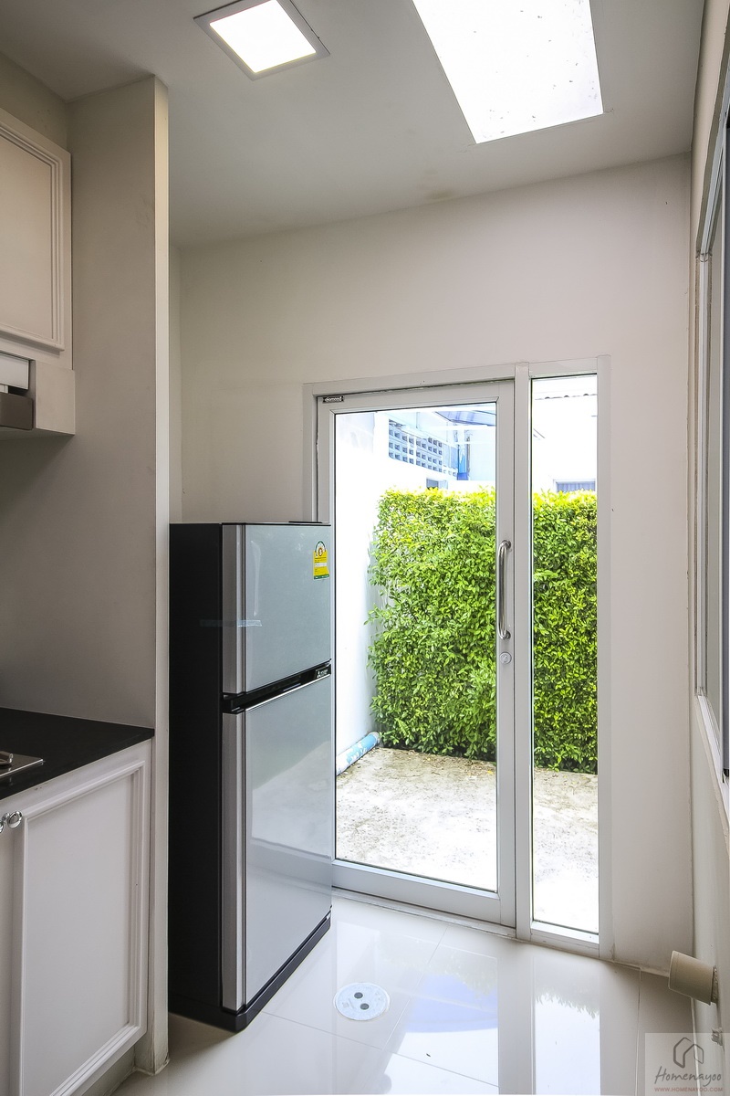 ถัดออกไปด้านนอกจะเป็นพื้นที่ซักล้าง ประตูทางออกไปหลังบ้านได้เป็นบาน UPVC สีขาว ลูกบิดกลมกดล็อกมาตรฐาน