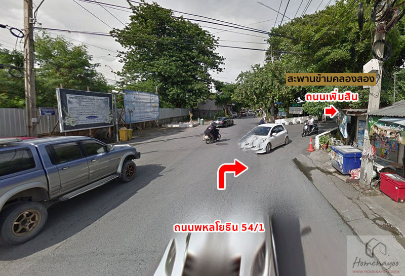 จากนั้นวิ่งตรงตาม ถนนพหลโยธิน 54/1 ระยะทางอีก 420 เมตร เลี้ยวขวาเข้าสู่ ถนนเพิ่มสิน (สะพานข้ามคลองสอง)