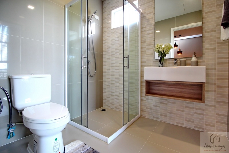 ห้องน้ำชั้นบนมีการแยกโซนแห้ง-เปียกที่ชัดเจน ด้วยการติดตั้งฉากอาบน้ำ