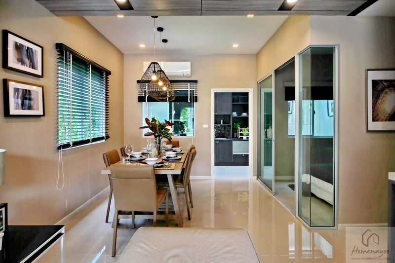 มุมรับประทานอาหาร ทางโครงการวางโต๊ะทานข้าวขนาด 6 ที่นั่งเป็นตัวอย่าง วางโต๊ะตามแนวลึกของตัวบ้าน ช่วยเปิดทางเดินไปสู่ห้องครัวให้ผ่านเข้าออกสะดวก