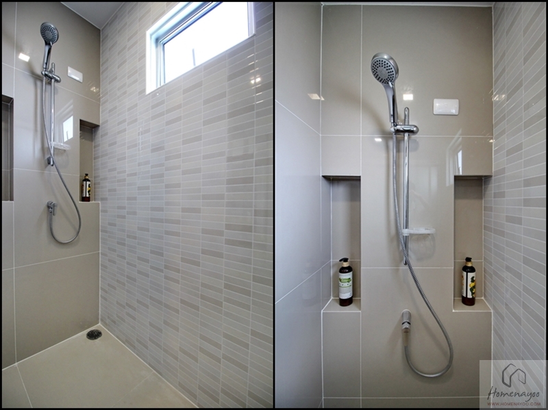 ห้องอาบน้ำให้ฝักบัวสายอ่อนแขวนบนราวที่ปรับระดับได้ ด้านหลังกำแพงเจาะช่องวางสบู่แชมพู 2 ช่อง วางระบบเครื่องทำน้ำอุ่นพร้อม