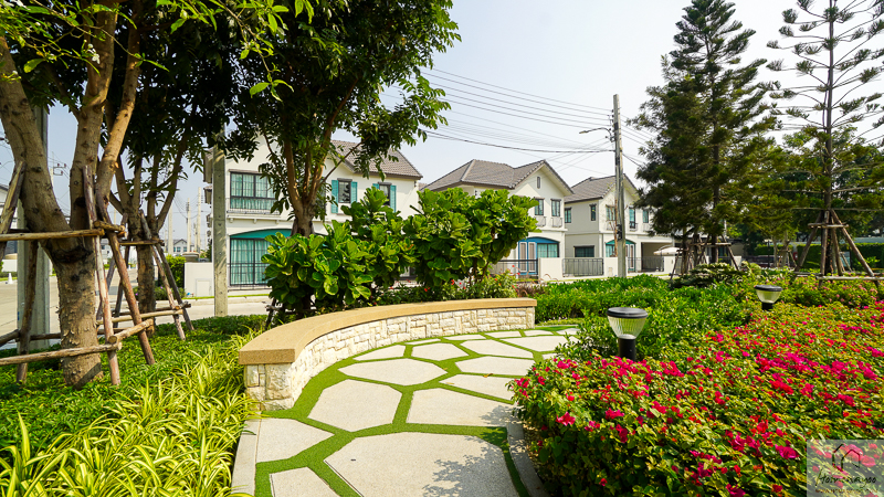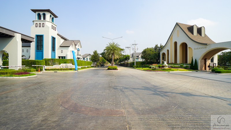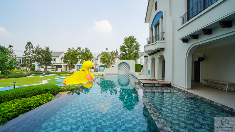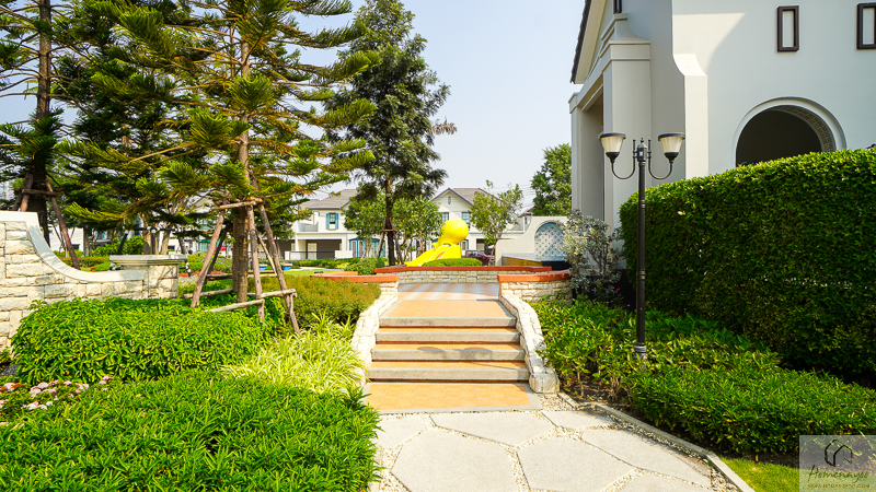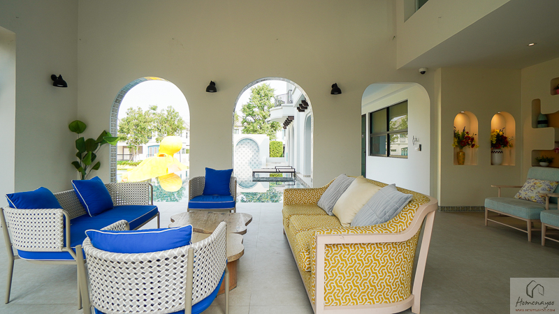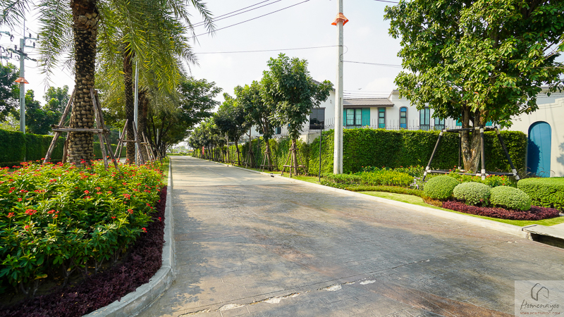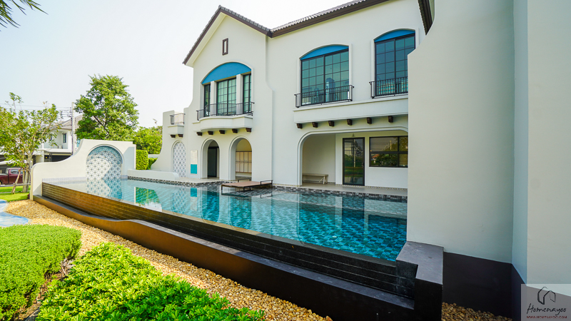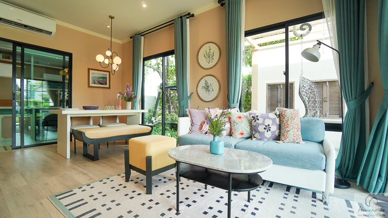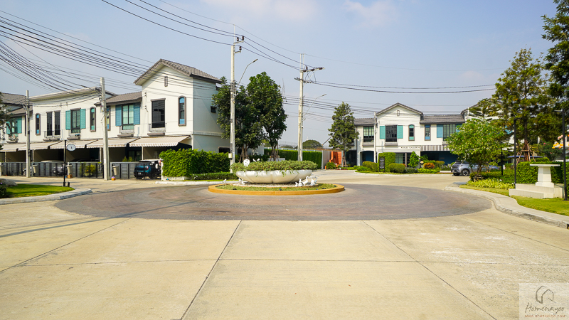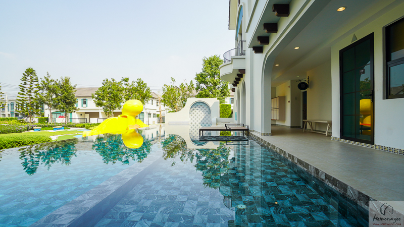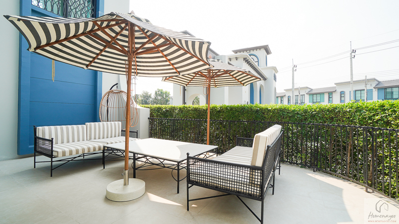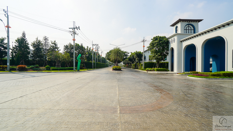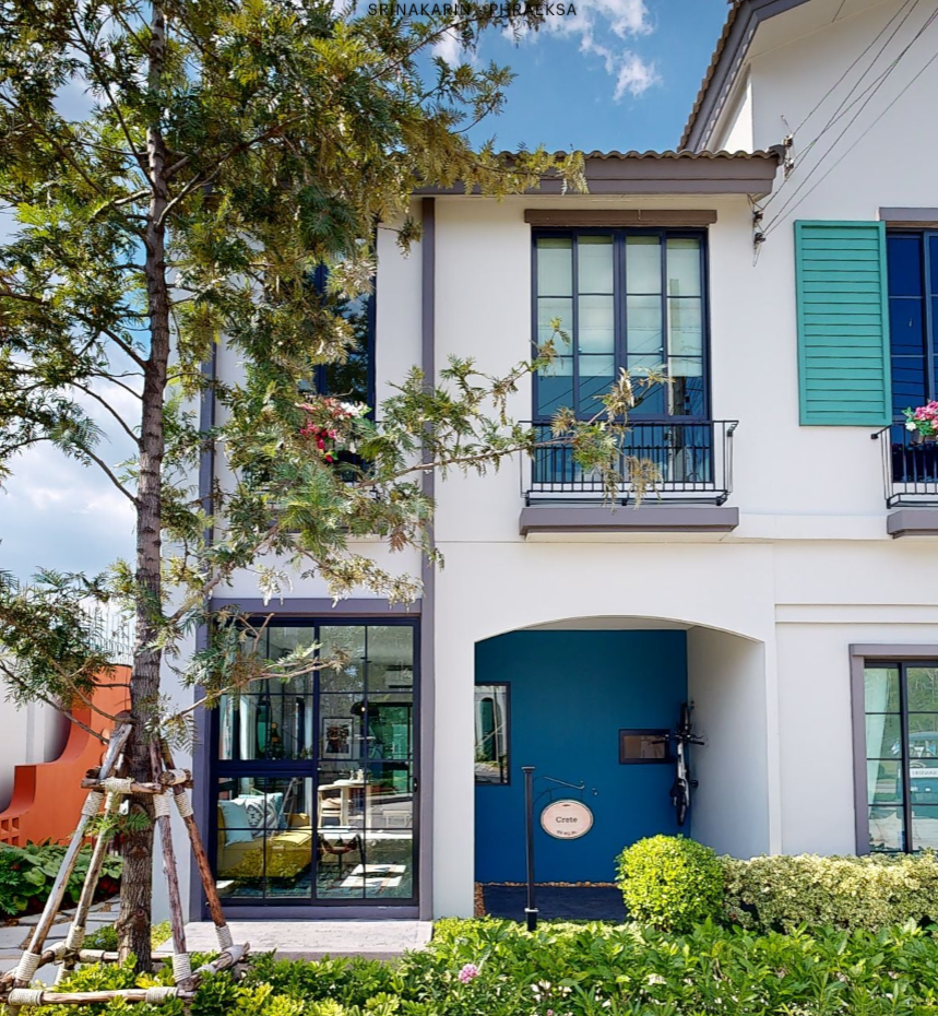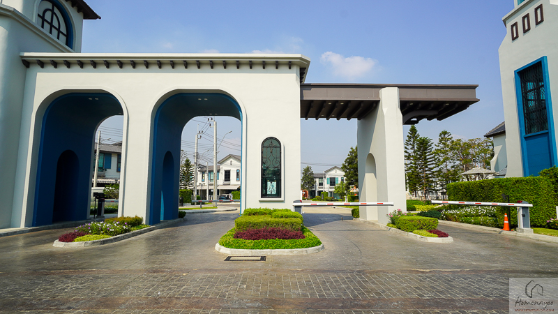 บรรยากาศภายในโครงการโดดเด่นด้วยดีไซน์เมดิเตอร์เรเนียน ที่เห็นชัดตั้งแต่ซุ้มทางเข้า Clubhouse สวนส่วนกลาง ไปจนถึงตัวบ้าน โทนสีอบอุ่น เส้นสายโค้งมน และรายละเอียดสถาปัตยกรรมที่ให้ฟีลเหมือนบ้านพักตากอากาศริมทะเล ช่วยสร้างความรู้สึกผ่อนคลายตั้งแต่ก้าวแรก แตกต่างจากโครงการแนวราบทั่วไปในย่านเดียวกัน