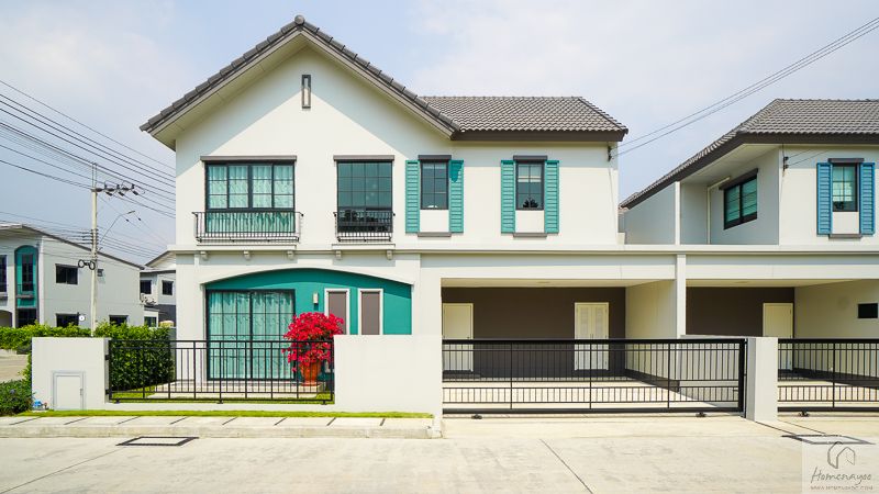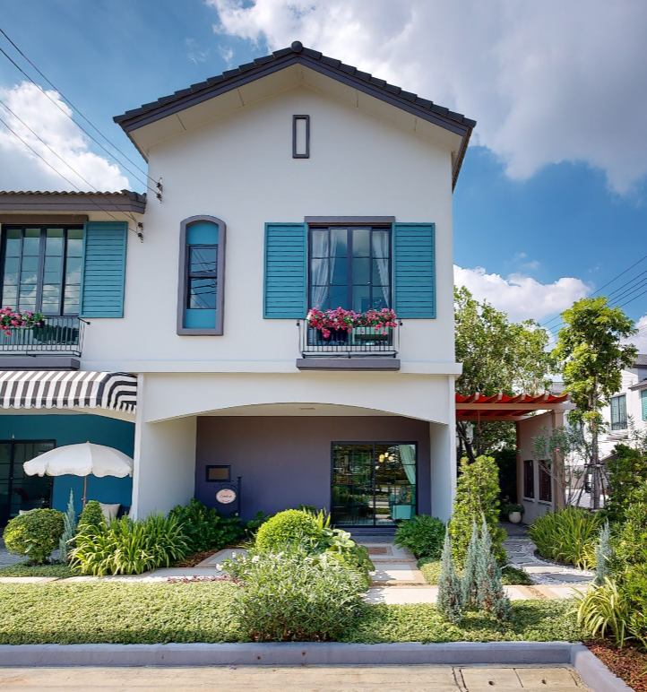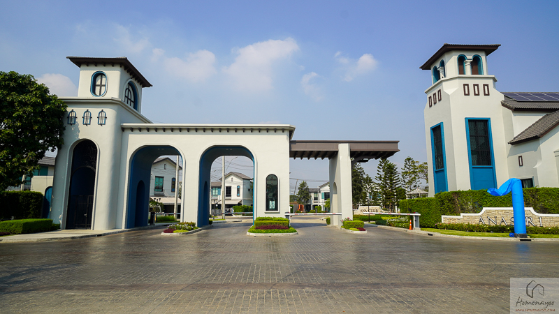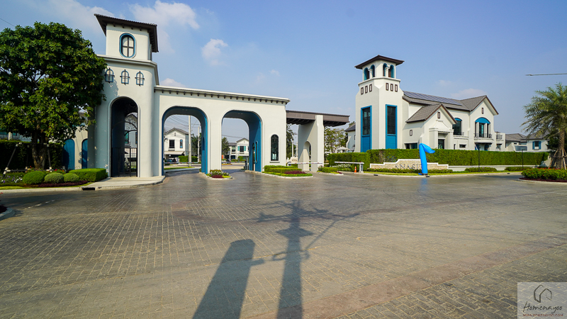 ⇒ การออกแบบโครงการ แบบบ้าน และวัสดุ : เอกลักษณ์ที่ทำให้โครงการนี้แตกต่างจากโครงการอื่น ๆ คือแนวคิดการออกแบบสไตล์เมดิเตอร์เรเนียน ที่ให้ฟีลเหมือนบ้านพักตากอากาศริมทะเล ทั้งโทนสีเทา-ขาว ตัดน้ำเงิน เส้นโค้งมน และหลังคาทรงจั่ว ช่วยให้อารมณ์บ้านดูอบอุ่น ผ่อนคลาย และมีคาแรกเตอร์ชัดเจนตั้งแต่ซุ้มทางเข้าไปจนถึงตัวบ้าน