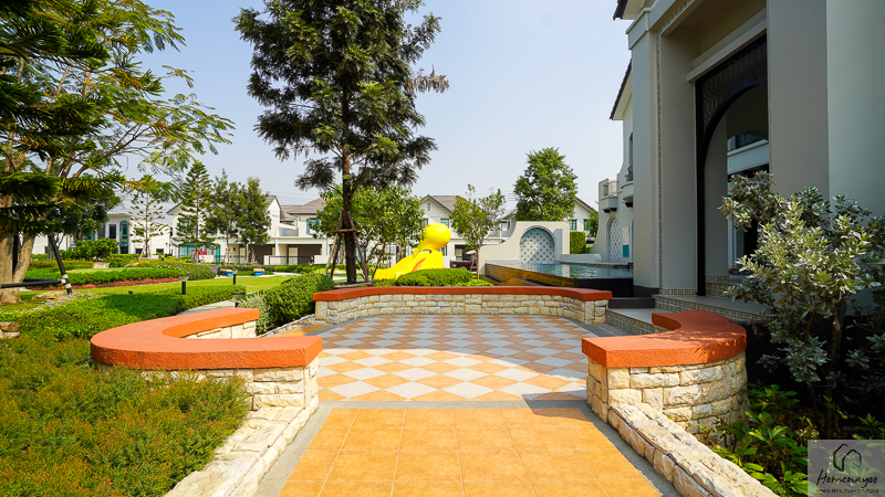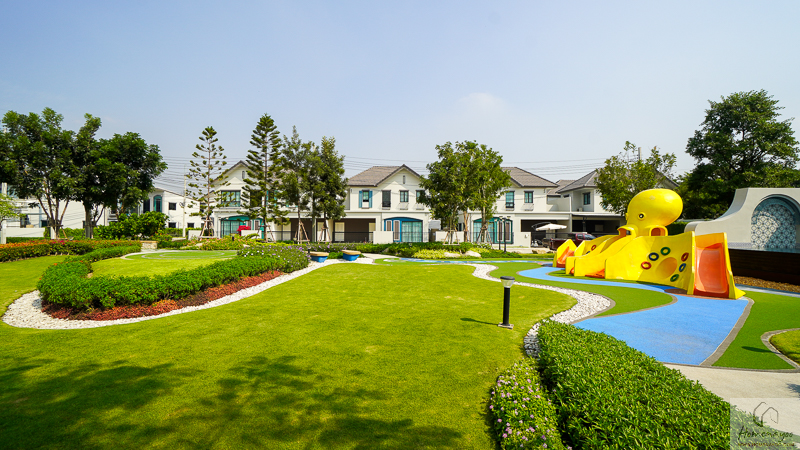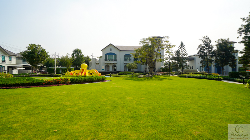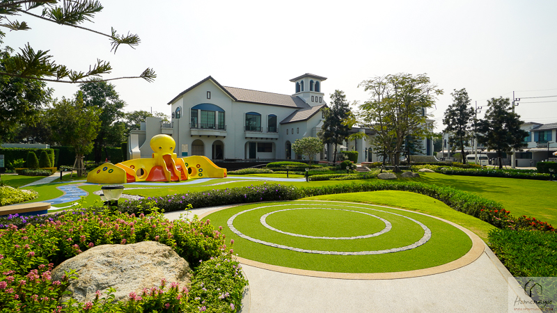 ด้านหน้า Clubhouse ยังเชื่อมต่อกับสวนส่วนกลางผืนใหญ่ บรรยากาศร่มรื่น มีทั้งลานสนามหญ้ากว้าง สนามเด็กเล่น มุมนั่งพักผ่อน และ Jogging Track วิ่งรอบสวนความยาวประมาณ 130 ม.* เหมาะทั้งเดินเล่น ออกกำลังกาย หรือใช้เวลาชิล ๆ ในช่วงเย็น