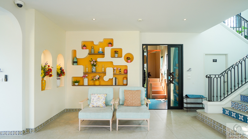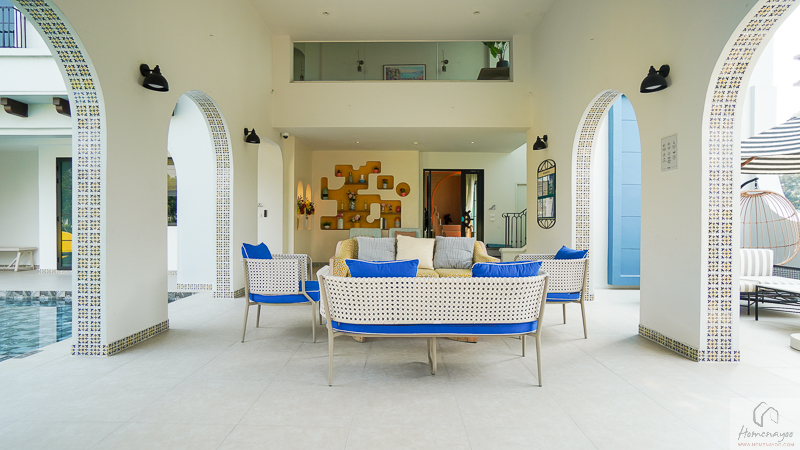 ดีไซน์ภายนอกบ้านยังคงหยิบเสน่ห์สถาปัตยกรรมเมดิเตอร์เรเนียนมาเป็นคอนเซ็ปต์หลัก เลือกใช้โทนเทาเข้ม-เทาอ่อนสร้างมิติให้ตัวอาคาร แล้วเติมดีเทลสีน้ำเงินเข้าไปเป็นจุดเด่น ช่วยให้ภาพรวมดูสดใสและมีเอกลักษณ์มากขึ้น