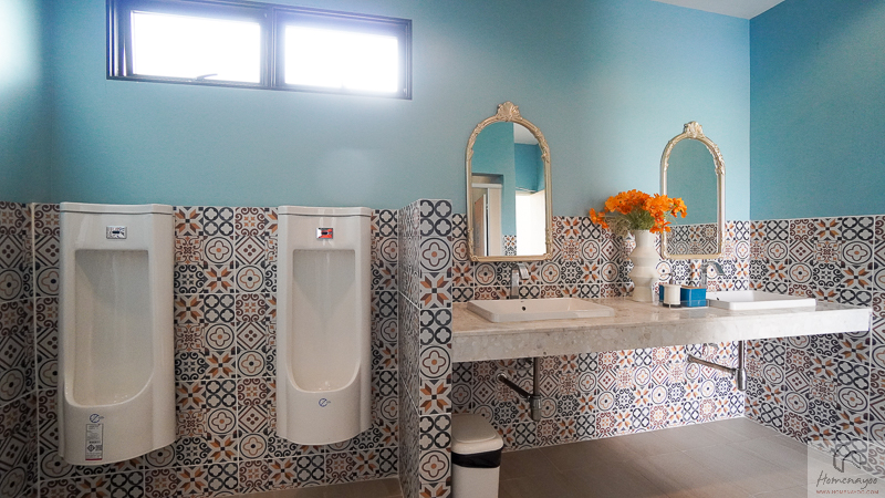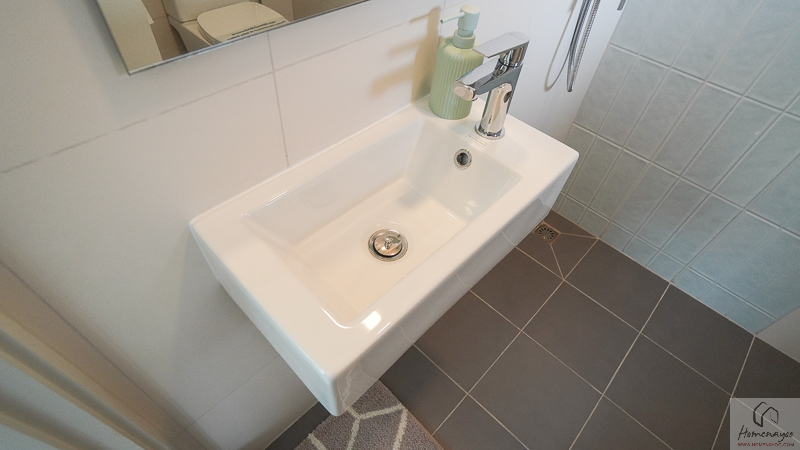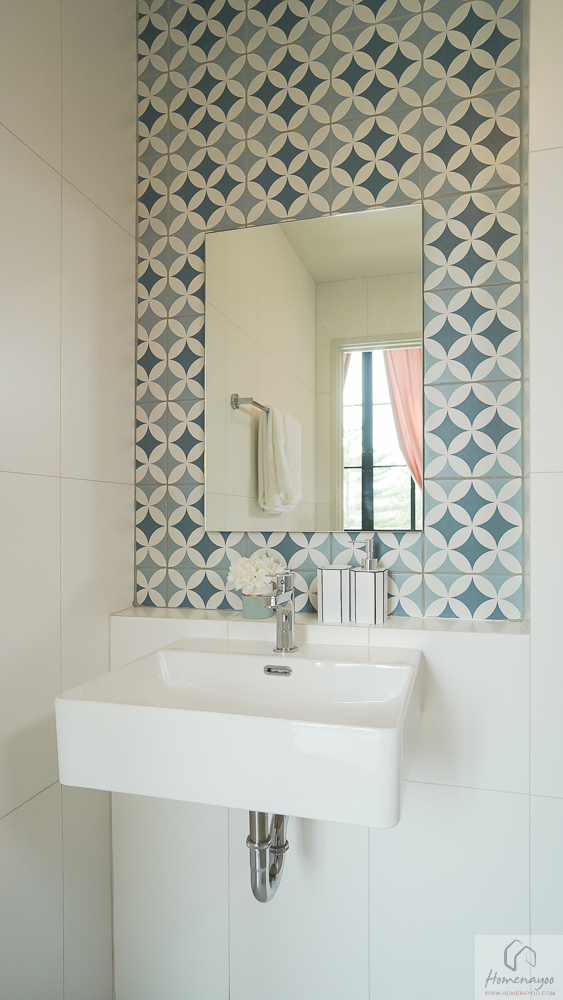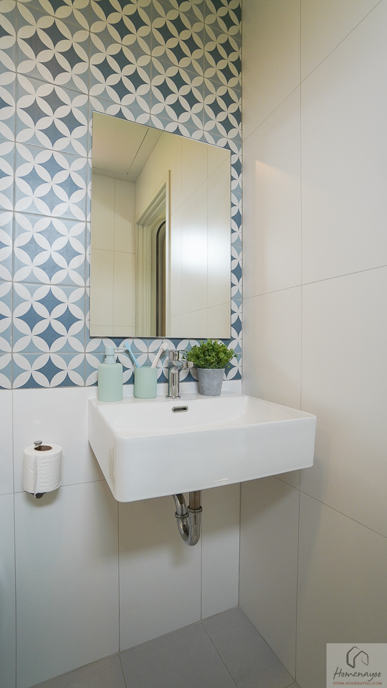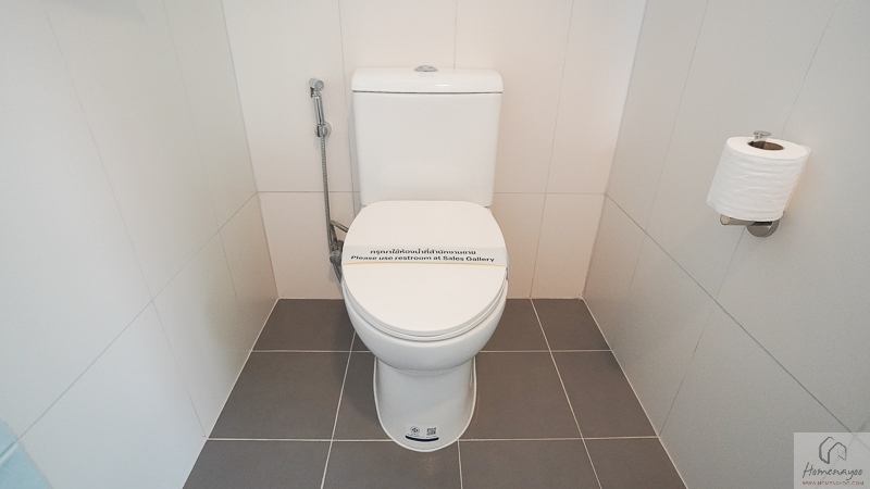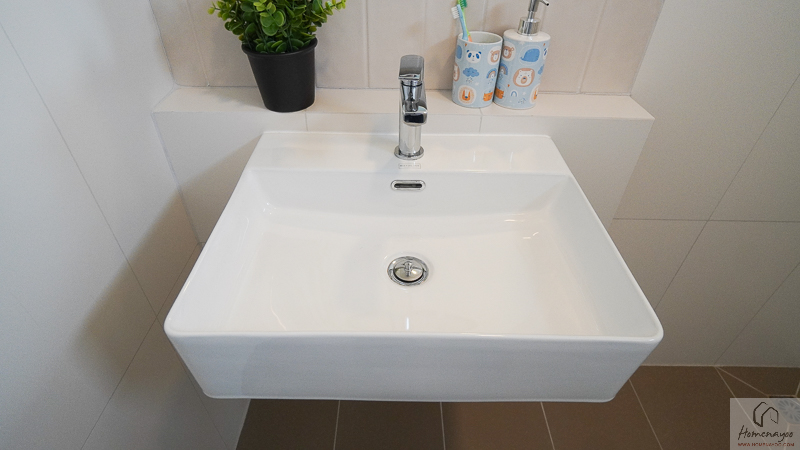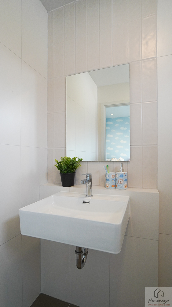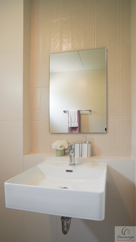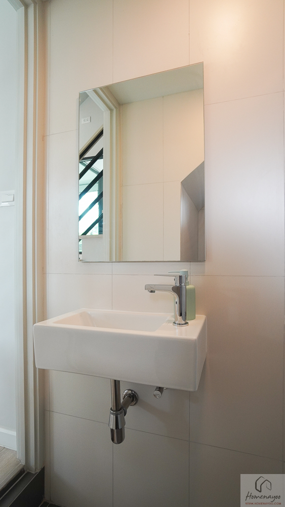 ได้อ่างล้างมือทรงเหลี่ยมขนาดใหญ่ ก๊อกน้ำแบบก้านโยก ด้านหลังอ่างจะมี Low-Wall ให้วางของใช้ได้ และมีกระจกเงาติดมาให้ 1 บาน ส่วนใต้อ่างจะมีพื้นที่เหลือไว้สำหรับวางถังขยะ และชั้นวางของเล็ก ๆ เพิ่มได้ด้วยค่ะ