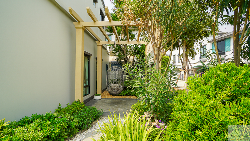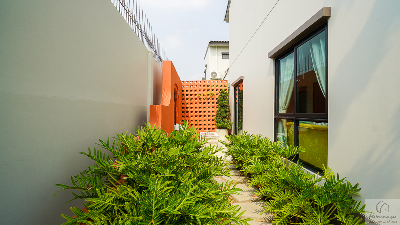 สำหรับบ้านหลังมุมจะได้พื้นที่ด้านข้างเพิ่มขึ้นมาอีกพอสมควร ทำให้ปรับใช้งานได้ยืดหยุ่นกว่าหลังกลาง จะจัดสวนเพิ่มความร่มรื่น วางชุดโต๊ะสนามเป็นมุมพักผ่อนแบบ Semi-Outdoor หรือทำชานนั่งเล่นรับลมก็ลงตัว