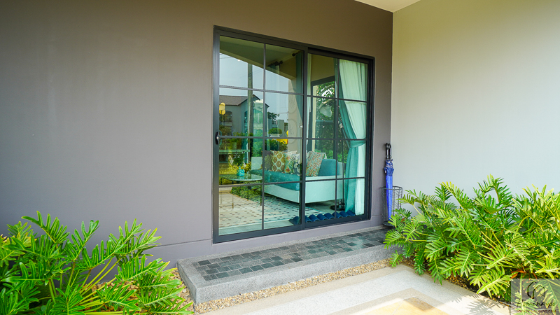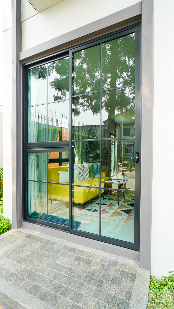 ส่วนประตูเลือกใช้บานเลื่อนลูกฟักกระจกเขียวตัดแสง กรอบอะลูมิเนียม Powder Coat สีดำ แข็งแรง ทนทาน ช่วยลดเสียงรบกวนจากภายนอก และไม่เป็นสนิมแม้ใช้งานในระยะยาว ดูแลรักษาง่ายและเหมาะกับการอยู่อาศัยจริงในทุกวัน