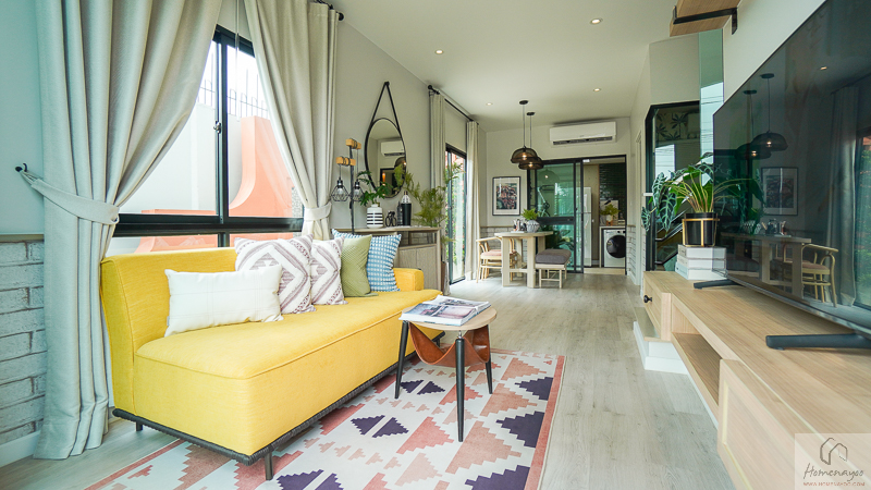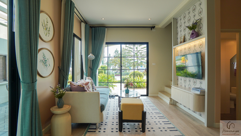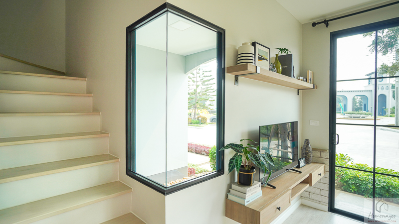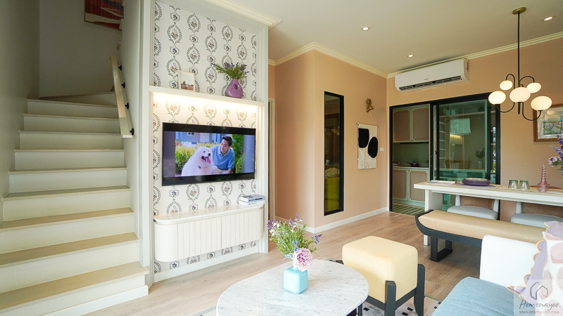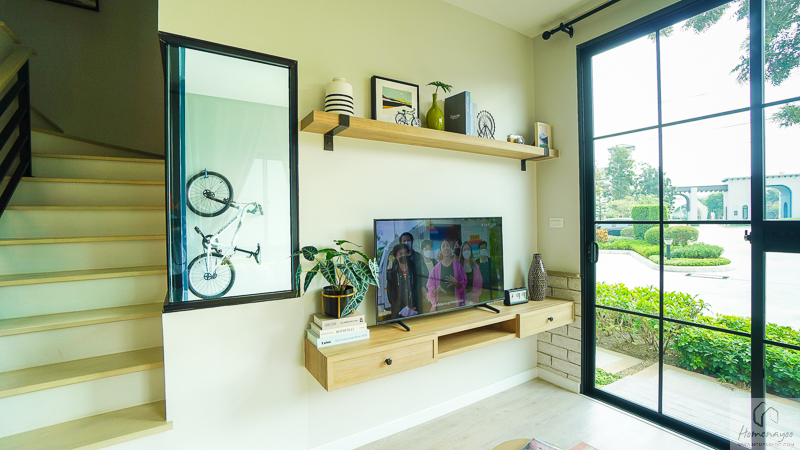 พอวางเฟอร์นิเจอร์ต่าง ๆ เข้าไปแล้ว จะมีพื้นที่ใช้งานตรงกลางเหลือกว้างกำลังพอดี สามารถนั่งดูทีวีจอ 50 นิ้ว และเดินเข้า-ออก รวมถึงขึ้นลงบ้านได้สะดวกค่ะ