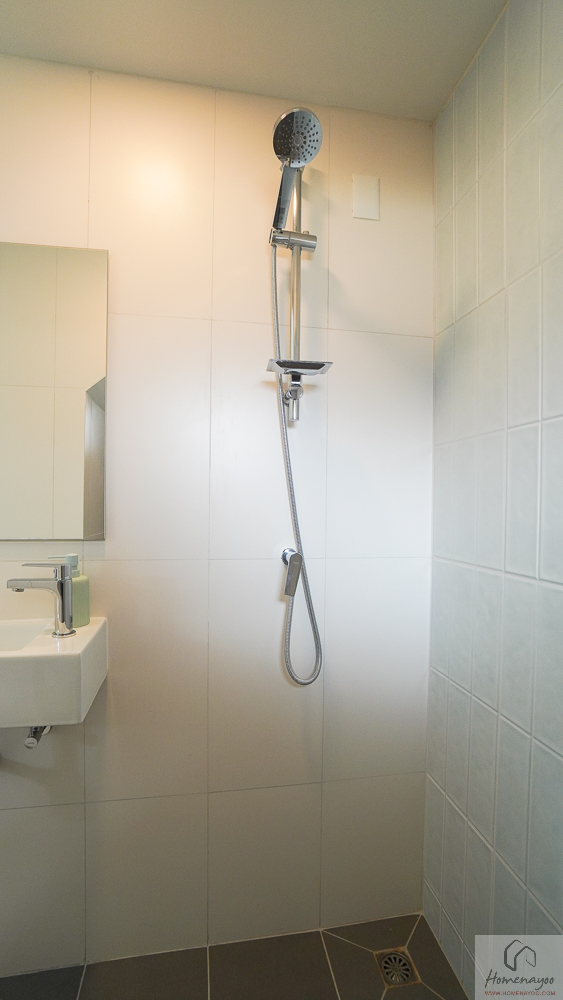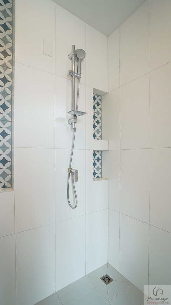 ส่วนอาบน้ำอยู่เข้ามุมห้อง ได้ฝักบัวพร้อมราวปรับระดับ รวมถึงชั้นวางของที่ผนัง และ Junction Box พร้อมต่อเครื่องทำน้ำอุ่นได้เลยค่ะ