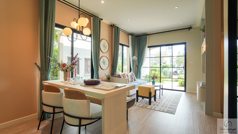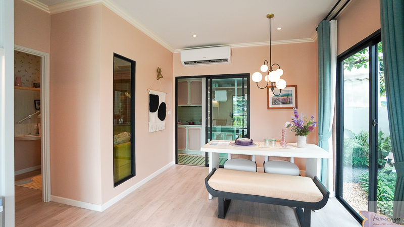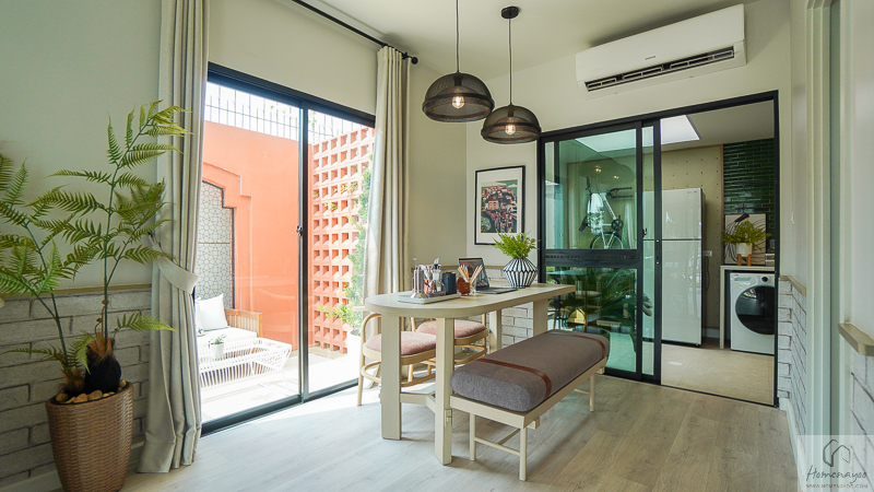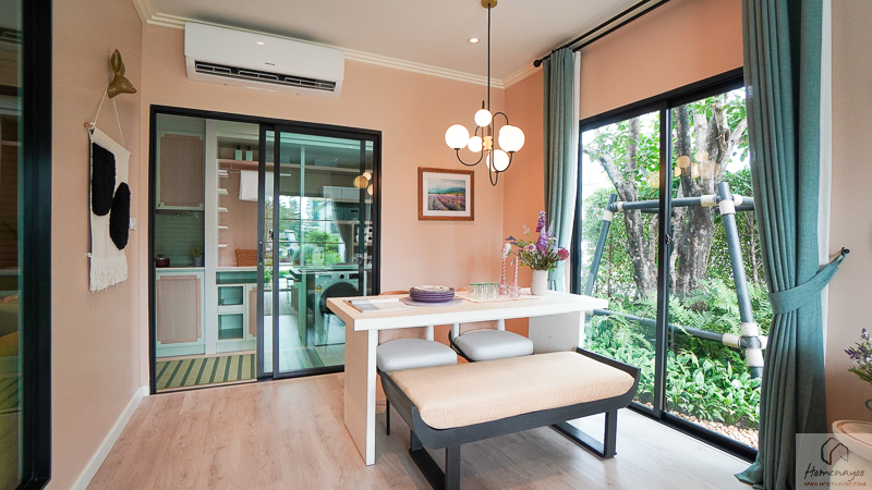 ถัดเข้าไปจะเป็นมุมทานอาหาร เชื่อมกับห้องครัวหลังบ้านได้ใกล้ ๆ ส่วนบ้านหลังมุมจะมีประตูกระจกบานเลื่อนให้เปิดเชื่อมต่อกับสวนข้างบ้านได้ด้วยค่ะ