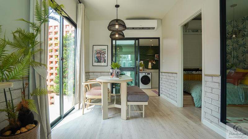 มุมนี้รองรับโต๊ะทานข้าวขนาด 4 ที่นั่งได้กำลังดี หรือวันไหนที่มีเพื่อน ๆ มาหาที่บ้าน ก็สามารถเสริมเก้าอี้หัว-ท้ายโต๊ะให้เป็น 6 ที่นั่งก็ยังไหว