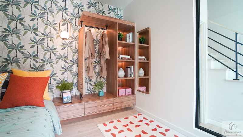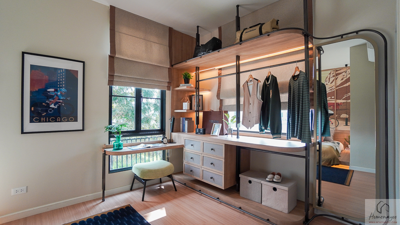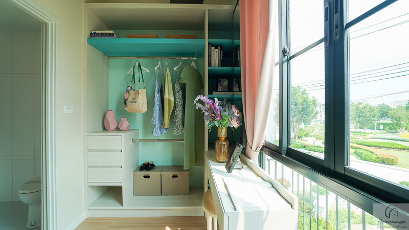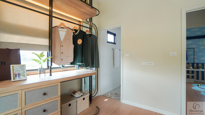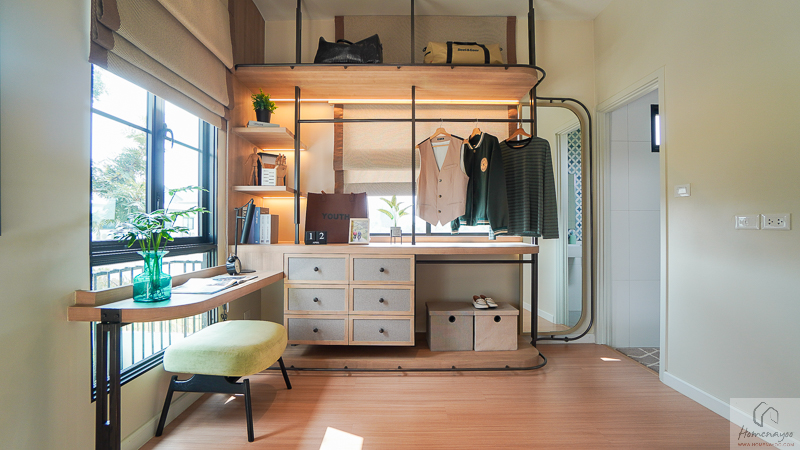 ในบ้านตัวอย่างวางม้านั่งพักผ่อน และตู้เสื้อผ้าแบบเปิดมาให้ดูระยะใช้งานค่ะ บ้านไหนที่มีสมาชิกยังไม่เยอะ จะทำเป็นห้องแต่งตัวส่วนกลางของสมาชิกในบ้านก็ได้นะคะ